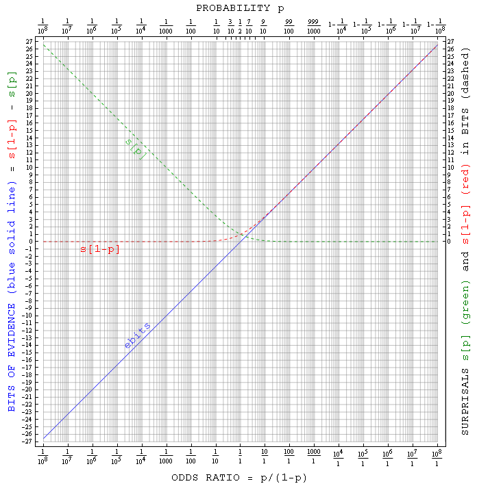 Although surprisals are quite useful when we are talking about things that are unlikely to happen, a similar measure is oft needed for assessing likely true-false hypotheses such as the guilt of someone suspected of a misdeed. A simple but robust measure of evidence for such hypotheses, designed to accomodate new information as it comes in (additively if new bits of evidence are independent), turns out to be the surprisal that a hypothesis is false minus the surprisal that it is true (cf. the figure at left plus items 7 and 9 here). The resulting mnemonic for this evidence in bits (ebits) becomes "odds ratio" = 2ebits. Thus "ebits" is just the binary-log version of good-old racetrack odds. It goes to zero when the odds of something are 50:50, and to negative and positive extremes slowly (like surprisal) as the probability approaches 0 or 1. An ebit of evidence for a proposition's truth means that it has 2:1 odds, two ebits means 4:1 odds, three ebits 8:1 odds, etc.