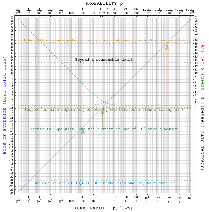 Thus surprisal differences (like ebits) can help assess the credibility of true-false assertions about the world around. For example, they are a potentially useful element of Bayesian* jurisprudence programs dedicated to development of objective tools for juries to work with in cases when the information they have can (like DNA evidence) be put into quantitative form. As you can see from the plot at right, the meanings of "innocent until proven guilty" and "reasonable doubt" in ebits dovetail seamlessly with their common-sense usage. Such surprisal measures are conceptually accessible to most citizens (at least providing an alternate visualization), and are adaptable to different levels of proof e.g. in civil versus criminal trials. However, they leave entirely up to human judgement whether the correct true-false question is being asked to begin with. It is likely that the quantitative modeling of individual culpability in the face of evidence, including the weighing of question alternatives, may be put onto an even more solid footing in days ahead via more general net-surprisal (KL-information) measures whose application development e.g. in ecology is already underway. For the time being those techniques are not yet ready for nonspecialists, and vice versa.* You can estimate the ebits of evidence for assertion (A) given what you already knew (X), plus some new information (E), using Bayes Theorem following item 7 here. We'll write p(C|D) for the probability that C is true given D, and e(C|D) for the corresponding evidence in bits. Then the evidence for A may be written e(A|EX) = e(A|X) + ln2[p(E|A)/p(E|¬A)] where ¬A means "not A" e.g. if A is guilty then ¬A means not guilty.